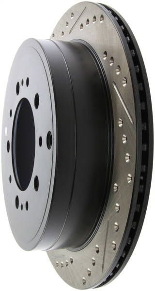 StopTech Drilled and Slotted Sport Rotors are 1-piece direct replacement brake discs for factory brake systems and stock calipers that look great behind your wheels – and offer significantly improved braking performance. The unique cross-drilling and slotting aids with heat and brake dust dispersal; prevents glazing of the pads; adds bite and improves wet and dry braking performance. Built to last; the black e-coating provides protection from corrosion and the high carbon metallurgy (in most applications) offers quieter operation; better crack resistance and increased performance.