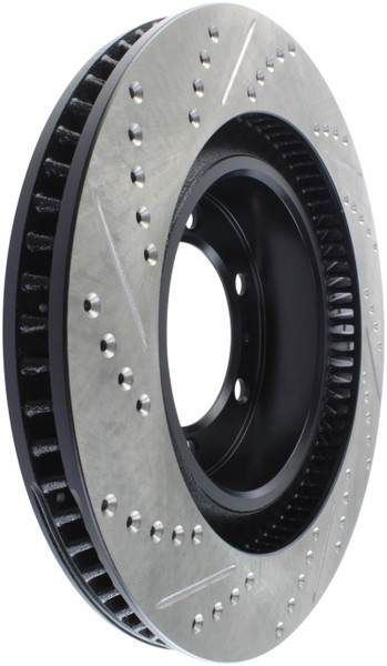 StopTech Drilled and Slotted Sport Rotors are 1-piece direct replacement brake discs for factory brake systems and stock calipers that look great behind your wheels - and offer significantly improved braking performance. The unique cross-drilling and slotting aids with heat and brake dust dispersal; prevents glazing of the pads; adds bite and improves wet and dry braking performance. Built to last; the black e-coating provides protection from corrosion and the high carbon metallurgy (in most applications) offers quieter operation; better crack resistance and increased performance.