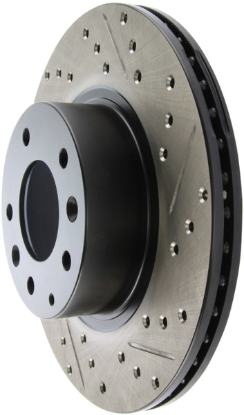 StopTech Drilled and Slotted Sport Rotors are 1-piece direct replacement brake discs for factory brake systems and stock calipers that look great behind your wheels - and offer significantly improved braking performance. The unique cross-drilling and slotting aids with heat and brake dust dispersal; prevents glazing of the pads; adds bite and improves wet and dry braking performance. Built to last; the black e-coating provides protection from corrosion and the high carbon metallurgy (in most applications) offers quieter operation; better crack resistance and increased performance.