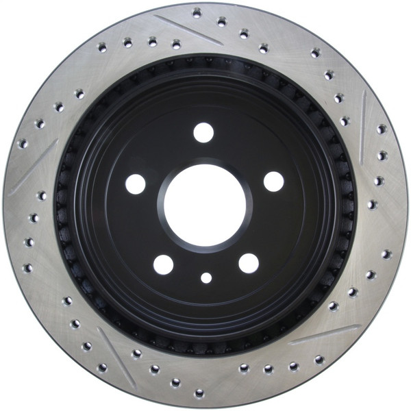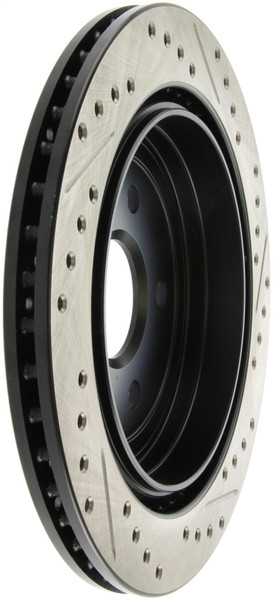 StopTech Drilled and Slotted Sport Rotors are 1-piece direct replacement brake discs for factory brake systems and stock calipers that look great behind your wheels – and offer significantly improved braking performance. The unique cross-drilling and slotting aids with heat and brake dust dispersal; prevents glazing of the pads; adds bite and improves wet and dry braking performance. Built to last; the black e-coating provides protection from corrosion and the high carbon metallurgy (in most applications) offers quieter operation; better crack resistance and increased performance.