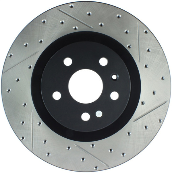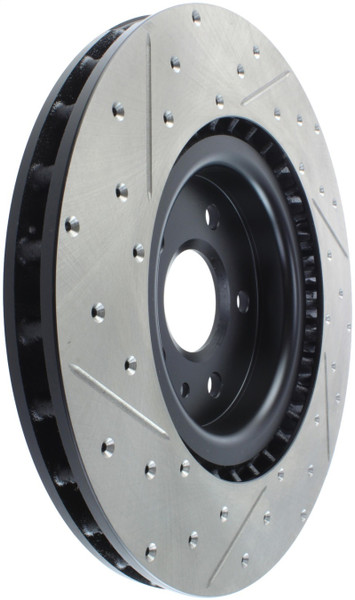 StopTech Drilled and Slotted Sport Rotors are 1-piece direct replacement brake discs for factory brake systems and stock calipers that look great behind your wheels – and offer significantly improved braking performance. The unique cross-drilling and slotting aids with heat and brake dust dispersal; prevents glazing of the pads; adds bite and improves wet and dry braking performance. Built to last; the black e-coating provides protection from corrosion and the high carbon metallurgy (in most applications) offers quieter operation; better crack resistance and increased performance.