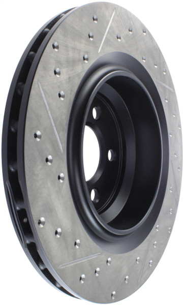 StopTech Drilled and Slotted Sport Rotors are 1-piece direct replacement brake discs for factory brake systems and stock calipers that look great behind your wheels - and offer significantly improved braking performance. The unique cross-drilling and slotting aids with heat and brake dust dispersal; prevents glazing of the pads; adds bite and improves wet and dry braking performance. Built to last; the black e-coating provides protection from corrosion and the high carbon metallurgy (in most applications) offers quieter operation; better crack resistance and increased performance.