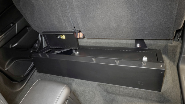This high security welded steel security lock box mounts under the rear seat in your 2014-2022 Chevy Colorado or GMC Canyon Crew Cab truck. The full width formfitting design of the Tuffy lock box has over 2100 cubic inches of lockable storage. Its secured contents are easily accessed by flipping either or both rear seat(s) up and opening the corresponding lid(s). The unique design allows the full width to be used to stow firearms or other long and valuable items. Featuring Tuffy's Pry-Guard Locking System with a 10 tumbler double bitted security lock with built in weather seals, the entire lock box conceals neatly under the lowered rear bench seat. The lock box is quickly and easily installed using the factory hardware without drilling.