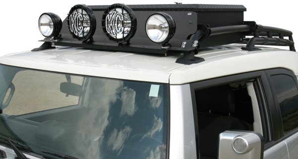 This stylish and functional light bar assembly mounts to the OEM factory roof rack on an FJ Cruiser. Is designed to accept four large lighting systems or six 4 inch lighting systems. A protective tray conceals and routes the wiring harnesses. Constructed using powder coated 1/8 inch thick steel. Lights not included.