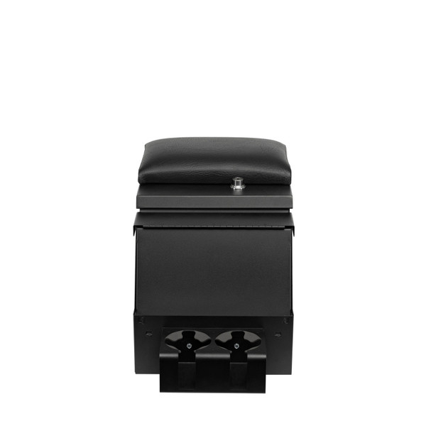 This convenient 12 1/2 inch wide, 16 gauge steel security console features Tuffy's patented pushbutton latch system. For safety and convenience while operating the vehicle, the lid also latches closed without having to be locked. It has 2 compartments, a separate compartment for mounting a stereo, CB Radio, or other electronic equipment, and a lockable rear storage space lined with a rubber floor mat. The spacious rear compartment accommodates a CD changer, tools, and other valuables.