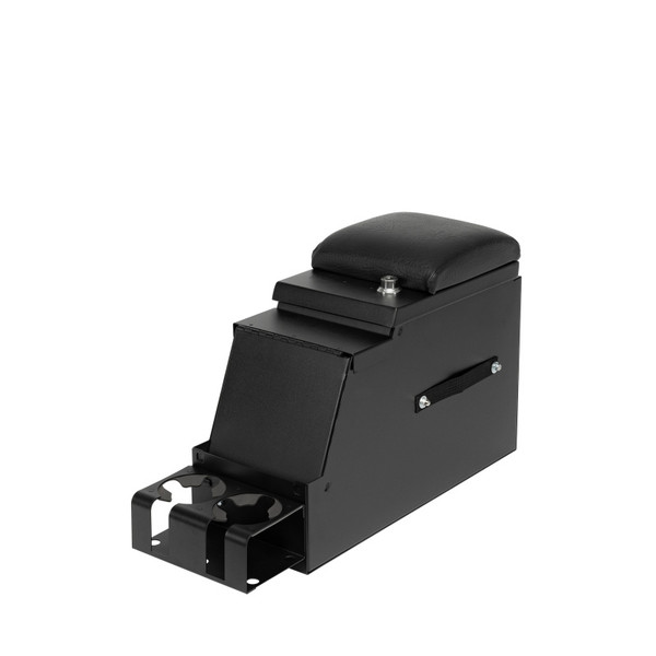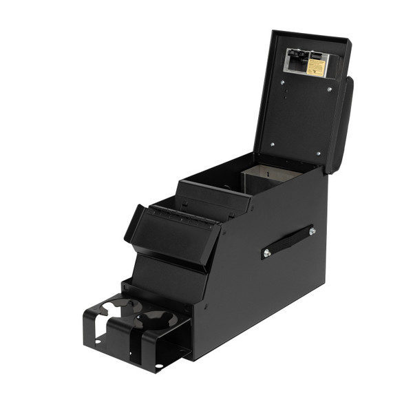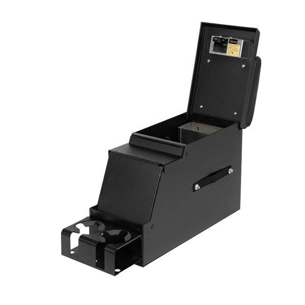 This convenient 8 inch wide steel security console features Tuffy's patented push-button latch system. For safety and convenience while operating the vehicle, the lid also latches closed without having to be locked. It has 2 compartments, a separate compartment for mounting a stereo, CB Radio, or other electronic equipment, and a lockable rear storage space lined with a rubber floor mat. The spacious rear compartment accommodates a CD changer, tools, and other valuables. Other accessories are also available.