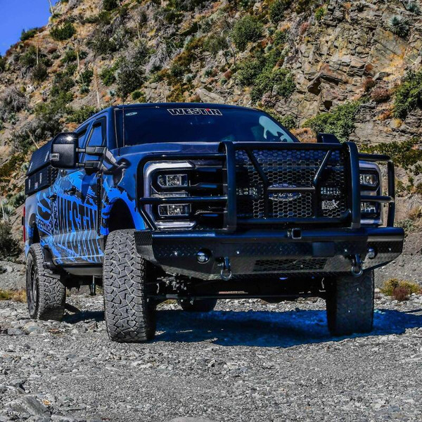Westins HDX Bandit Bumper combines a heavy duty diamond plate steel bumper constructed of schedule 40 steel pipe with a stylish grille guard featuring 2in. diameter outer wraparound wings and 2 3/4in. wide upright rubber strips. Designed to protect headlights, grille, hood and front fenders from road hazards, debris and wildlife damage. Features a stylish metal honeycomb mesh screen, which allows maximum airflow to the intercooler or radiator area while accenting the front end styling with a clean and rugged look.
