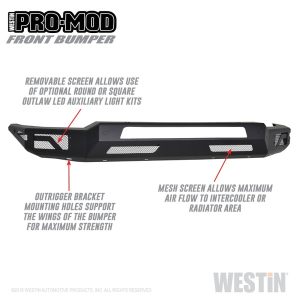 Westins Pro-Mod Front Bumper combines enhanced vehicle protection, with great looks. Pro-Mods revolutionary lightweight modular design is uniquely engineered with outrigger reinforcement brackets to provide maximum front end protection without compromising on strength, integrity or durability. The "high and tight" bumper profile creates a greater approach angle, which significantly improves off-road driving capabilities. The lightweight design also requires smaller shipping packages which dramatically reduces shipping costs. Pro-Mod bumpers feature a textured black finish with an e-coated base coat, providing long lasting corrosion protection from the elements. Once you see the Pro-Mod Front Bumper, the choice becomes obvious.