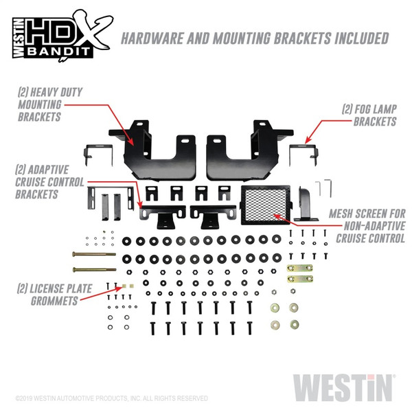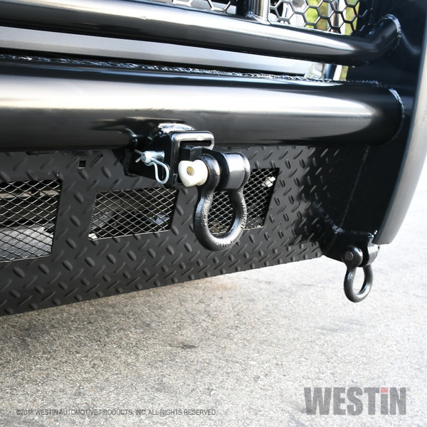 Westins HDX Bandit Bumper combines a heavy duty diamond plate steel bumper constructed of schedule 40 steel pipe with a stylish grille guard featuring 2in. diameter outer wraparound wings and 2 3/4in. wide upright rubber strips. Designed to protect headlights, grille, hood and front fenders from road hazards, debris and wildlife damage. Features a stylish metal honeycomb mesh screen, which allows maximum airflow to the intercooler or radiator area while accenting the front end styling with a clean and rugged look.