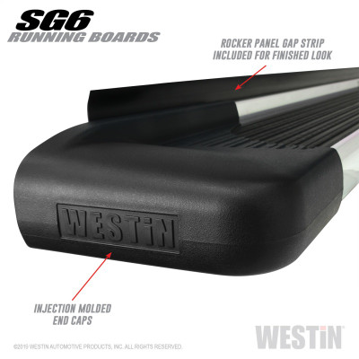 Westin's SG6 Running Boards feature textured slip resistant step pads enhancing footing in virtually all weather conditions. SG6 Running Boards also include a rocker panel gap strip to provide users with the appropriate Westin finished look. A polished aluminum finish with a protective anodized coating prevents oxidation increasing durability and extending product life. A vehicle specific mount kit is required and sold separately. Choose Westin's SG6 Running Boards for the perfect balance between safety, function and style!