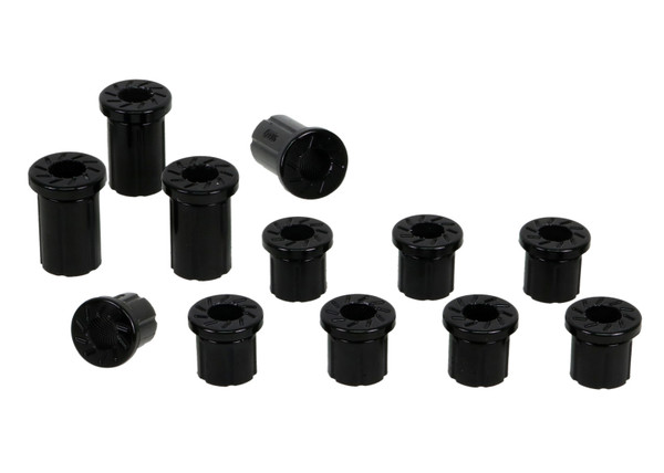 A critical service item for any leaf sprung vehicle. High kilometres and heavy load carrying causes excessive wear on rubber bushings. Whiteline's signature black bushings are made tough and offer outstanding abrasion resistance, high load bearing capability (4WD's, utes and towing), flexibility, increased tensile strength and chemical resistance to oil, grease, ozone and weathering.